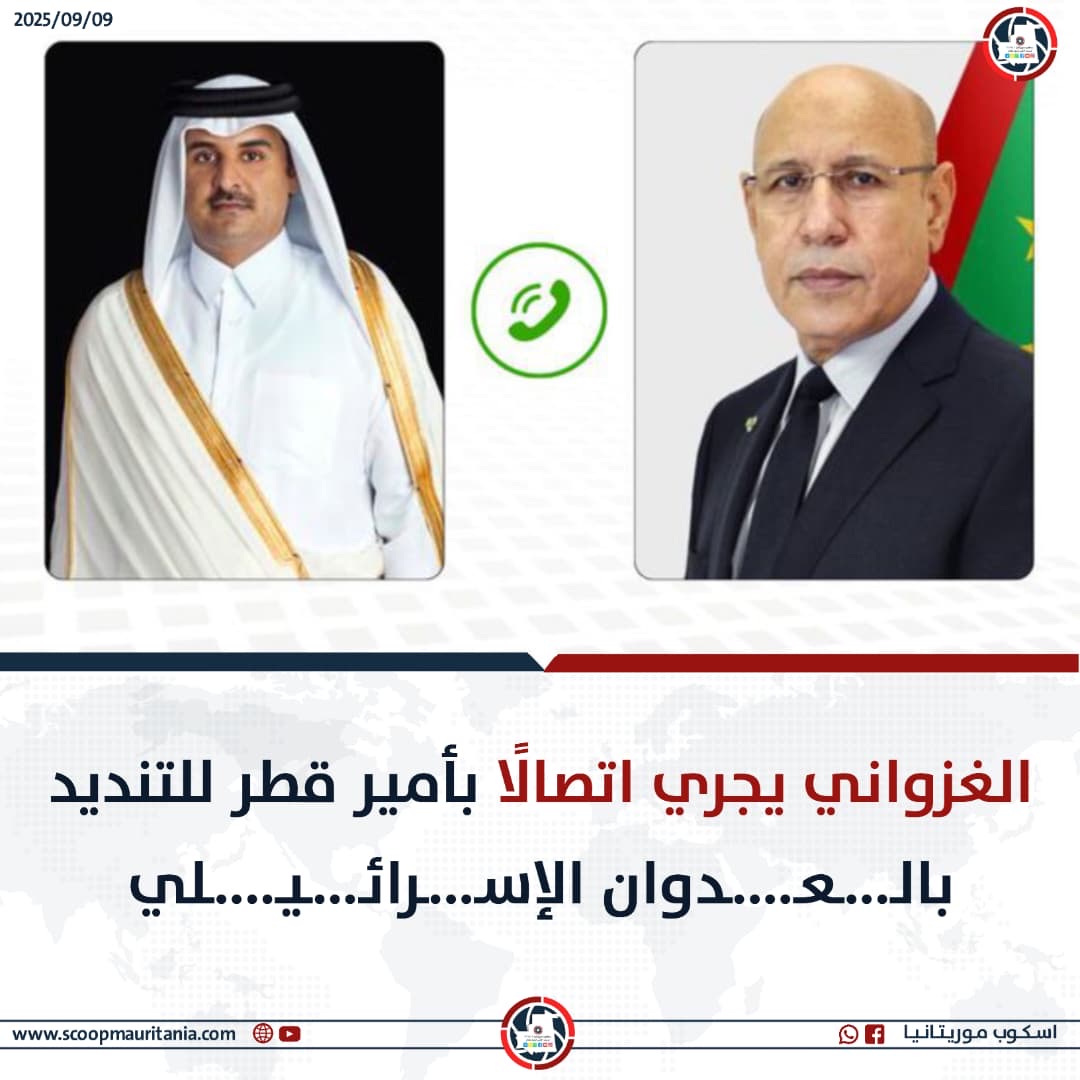 (نواكشوط) – أجرى الرئيس الموريتاني محمد ولد الشيخ الغزواني، اليوم، اتصالًا هاتفيًا بتميم بن حمد آل ثاني، أمير دولة قطر، إثر العدوان الإسرائيلي الذي استهدف الدوحة.
