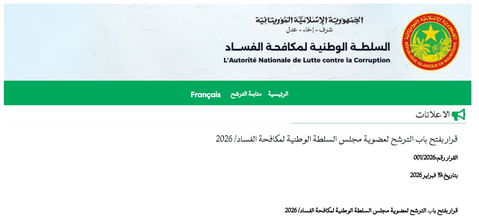 (المرابطون Tv) أعلنت لجنة انتقاء أعضاء مجلس السلطة الوطنية لمكافحة الفساد فتح باب الترشح لعضوية مجلس السلطة مؤكدة أن إيداع الملفات يبدأ من يوم الاثنين 23 فبراير 2026 الى غاية الثلثاء ال10 مارس القادم.