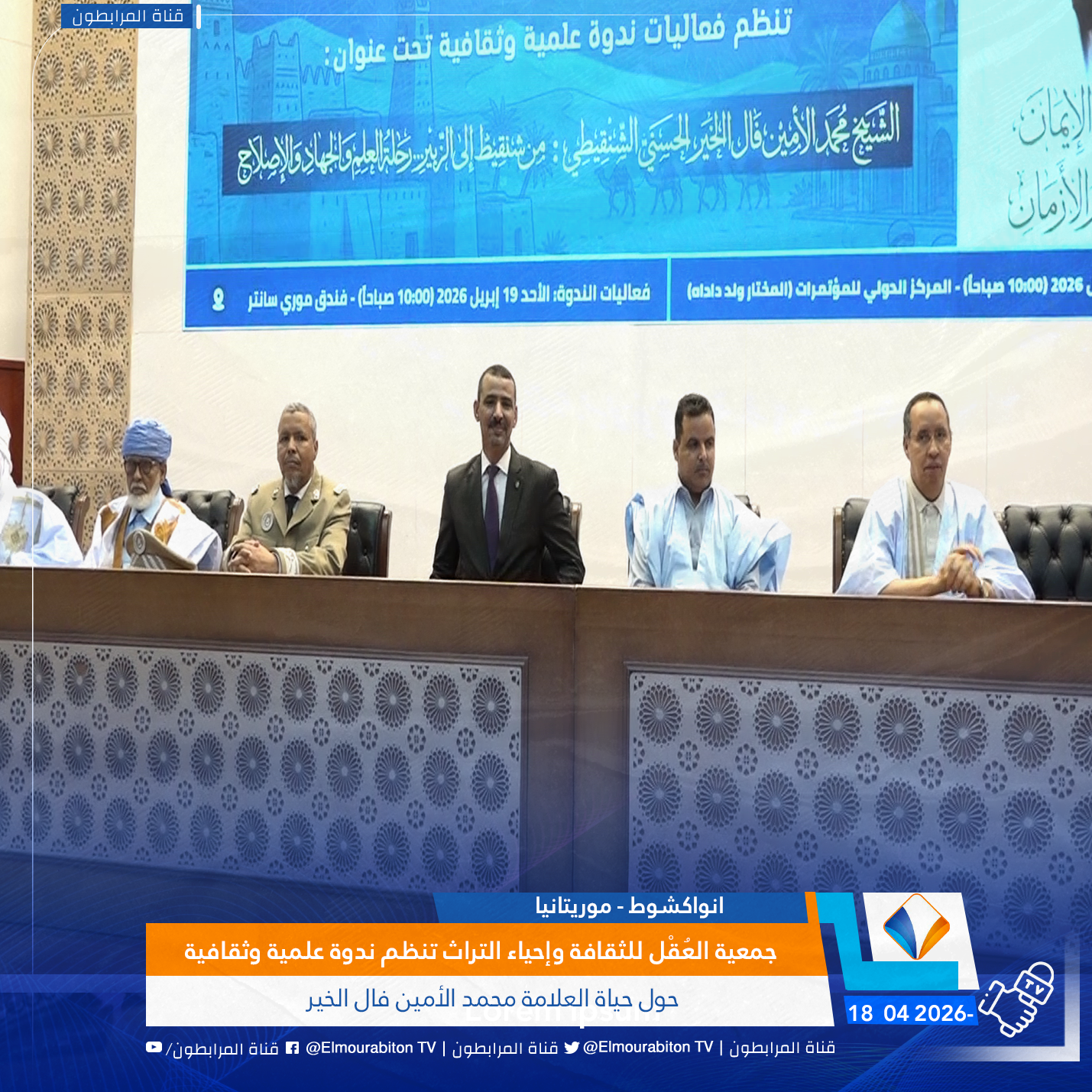 (المرابطون Tv) نظمت جمعية العُقْل للثقافة وإحياء التراث اليوم السبت بالعاصمة انواكشوط ندوة علمية وثقافية تحت شعار : “الشيخ محمد الأمين فال الخير الحسني الشنقيطي: من شنقيط إلى الزبير… رحلة العلم والجهاد والإصلاح”