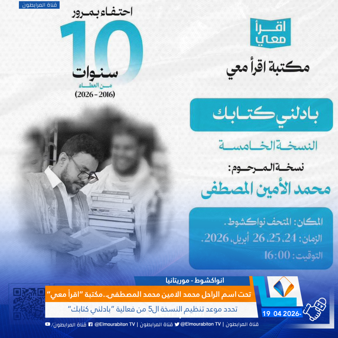 (المرابطون Tv) أعلنت مكتبة “اقرأ معي” عن تنظيم النسخة الخامسة من فعالية “بادلني كتابك”، أيام 24 و25 و26 من أبريل الجاري بانواكشوط احتفاءً باليوم العالمي للكتاب.