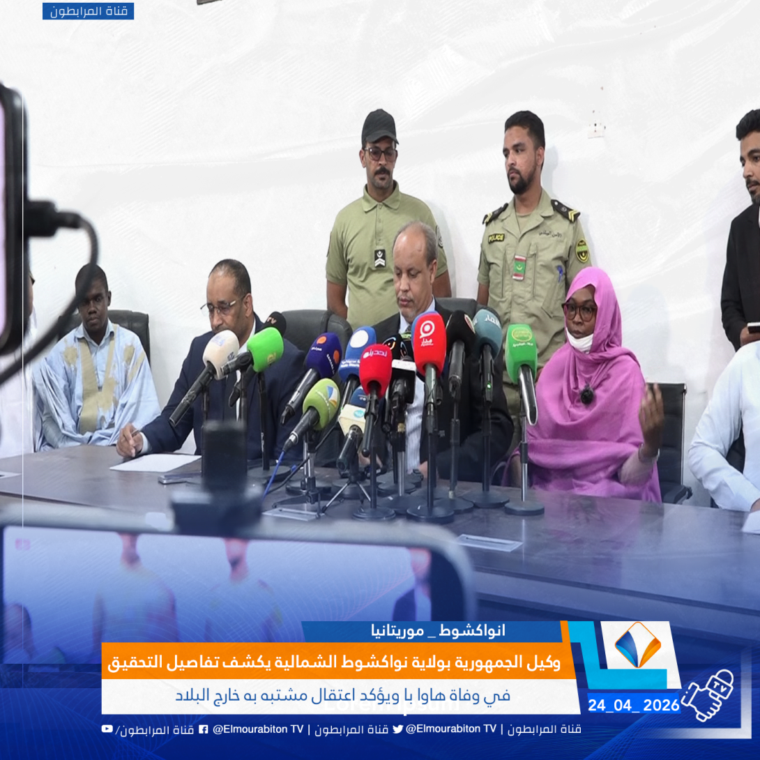 (المرابطون Tv) اكد وكيل الجمهورية بولاية نواكشوط الشمالية، الشيخ باي ولد السيد, توقيف مشتبه به خارج البلاد، بعد التحقيقات التي اجريت في قضية وفاة الشابة هاوا با, مضيفا أن نتائج التشريح لم تُظهر وجود أي إصابات خارجية أو داخلية على الجثمان.