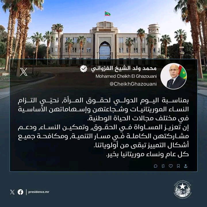 في رسالة تهنئة..ولد الغزوني يؤكد استمرار الدولة في سياساتها لتمكين المرأة