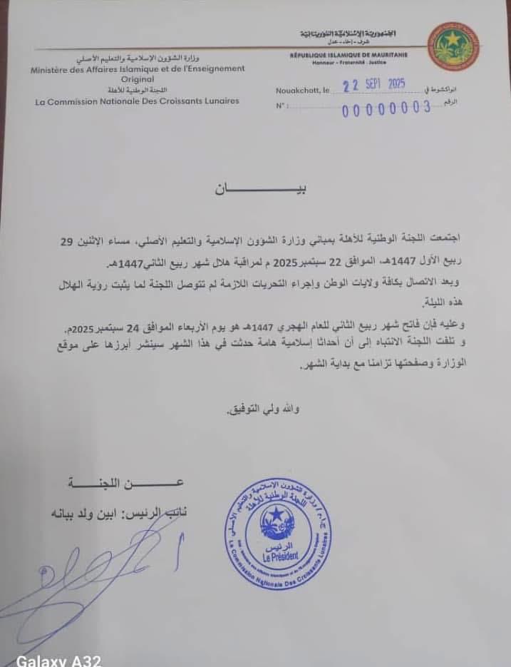 أعلنت اللجنة الوطنية للأهلة بوزارة الشؤون الإسلامية والتعليم الأصلي، مساء الاثنين 29 ربيع الأول 1447هـ الموافق 22 سبتمبر 2025، أنه بعد التحري والاتصال بجميع ولايات الوطن لم يثبت ما يؤكد رؤية هلال شهر ربيع الثاني هذه الليلة.