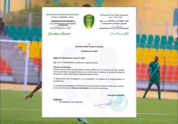 أعلن الاتحاد الموريتاني لكرة القدم موافقته على خوض نادي لكصر مبارياته في منافسات البطولة الوطنية “سوبر 1” للموسم الرياضي 2025-2026 على أرضية الملعب البلدي في لكصر.