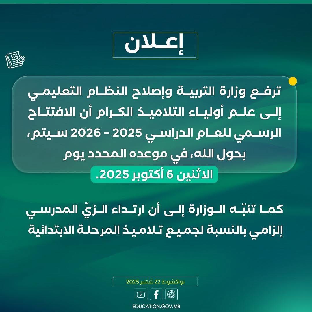 وأكدت الوزارة في بيان لها أن ارتداء الزي المدرسي سيكون إلزاميًا بالنسبة لجميع تلاميذ المرحلة الابتدائية، داعية أولياء الأمور إلى الحرص على تطبيق هذا القرار الذي يهدف إلى ترسيخ الانضباط وتعزيز الهوية المدرسية.
