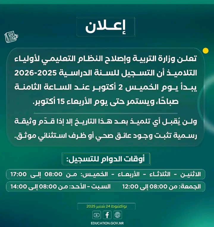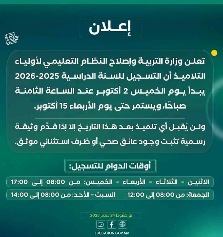 وبحسب إعلان نشرته الوزارة اليوم السبت فسيستمر التسجيل حتى يوم الأربعاء الموافق للـ 15 من نفس الشهر, مؤكدة أن أي تسجيل خارج هذا الأجل لن يُقبل إلا إذا قدم ولي الأمر وثيقة رسمية تثبت وجود عائق حال دون إكمال الإجراءات في الوقت المحدد.