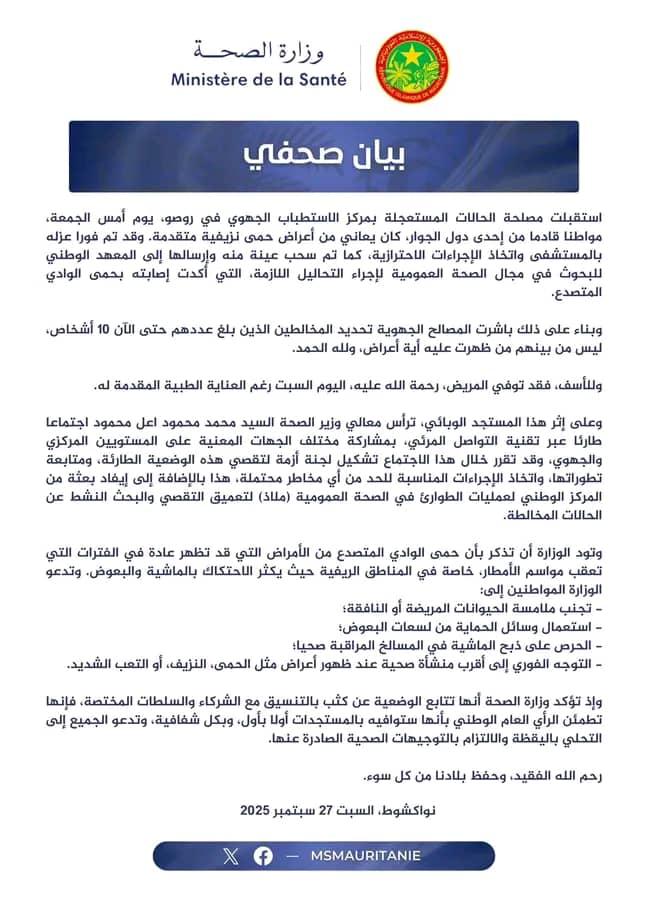 (المرابطون Tv) أكدت وزارة الصحة الموريتانية مساء امس السبت، وفاة مواطن في مدينة روصو بولاية اترارزة بعد إصابته بحمى الوادي المتصدع.