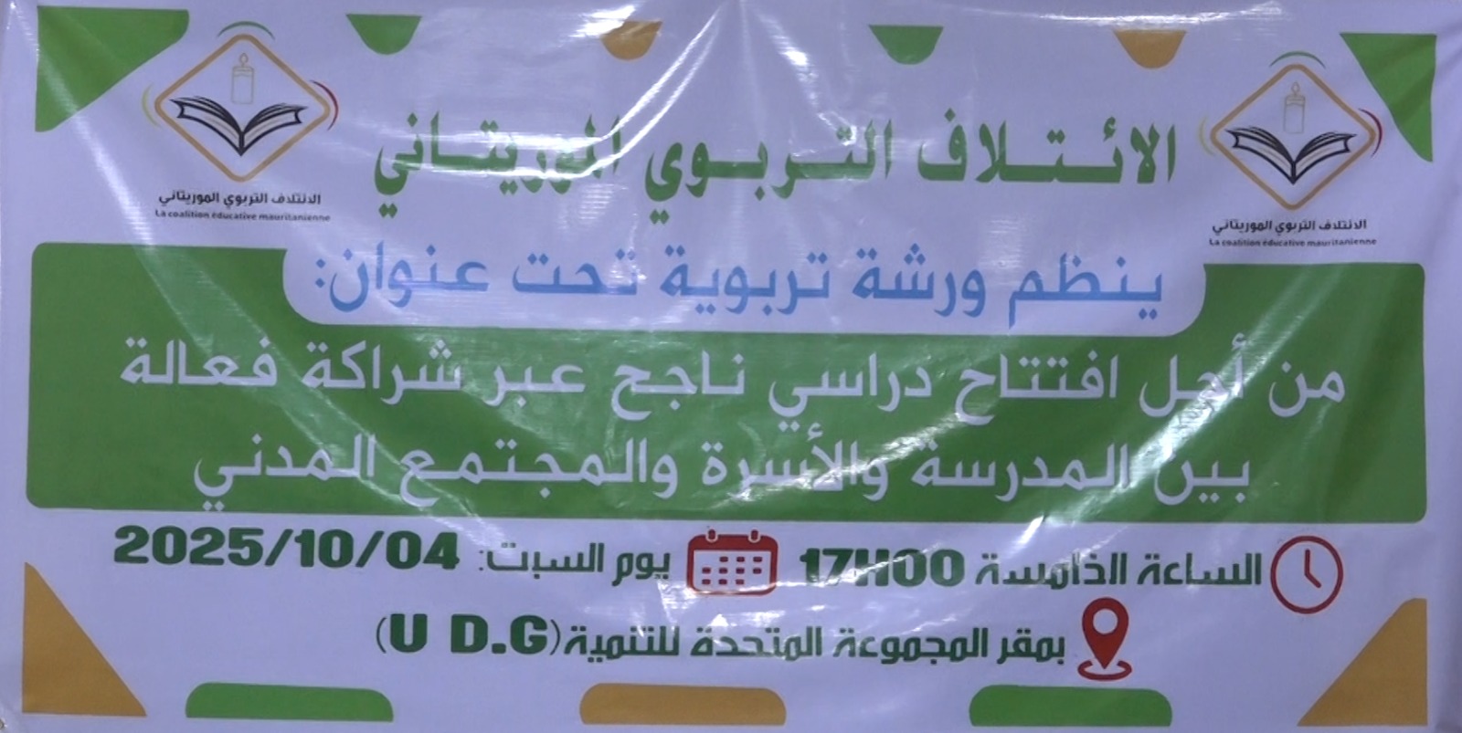 (المرابطون Tv) نظم الائتلاف التربوي الموريتاني ندوة علمية السبت بمناسبة افتتاح العام الدراسي الجديد 2025 - 2026 تحت عنوان معا من أجل افتتاح دراسي ناجح عبر شراكات فعالة بين الأسرة والمدرسة والمجتمع المدني