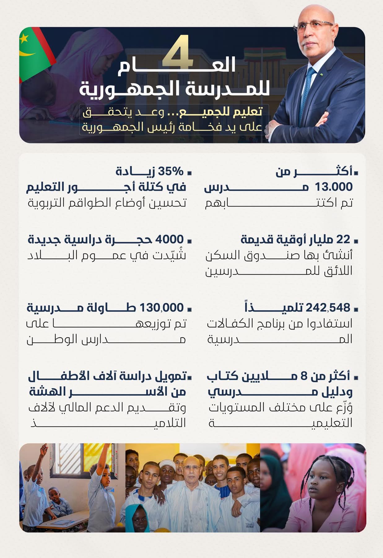 كما تم توزيع أكثر من 130 ألف طاولة مدرسية على المؤسسات التعليمية، وإنشاء صندوق للسكن اللائق للمدرسين بميزانية بلغت 22 مليار أوقية قديمة، إلى جانب توزيع أكثر من 8 ملايين كتاب ودليل مدرسي على مختلف المستويات.