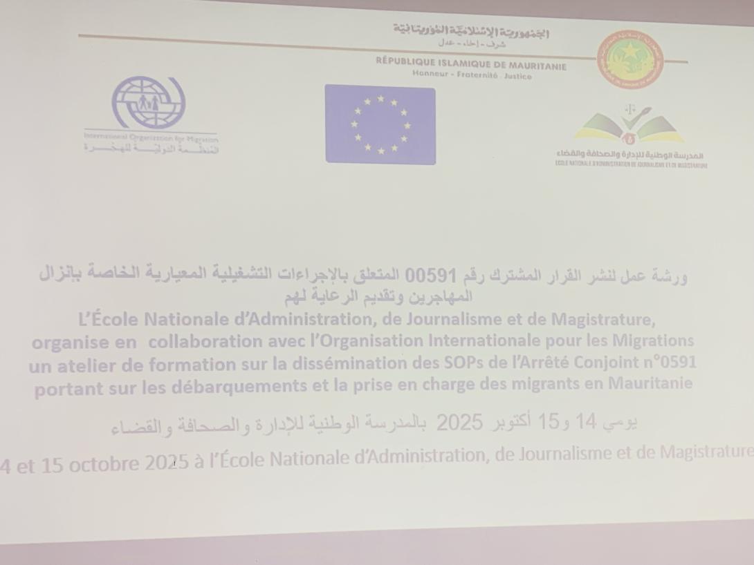 نواكشوط – افتُتحت اليوم الثلاثاء في مباني المدرسة الوطنية للإدارة والصحافة والقضاء، أعمال ورشة تكوينية حول القرار المشترك رقم 00591 الصادر بتاريخ 30 مايو 2025، والمتعلق بالإجراءات التشغيلية المعيارية الخاصة بإنزال المهاجرين وتقديم الرعاية لهم.