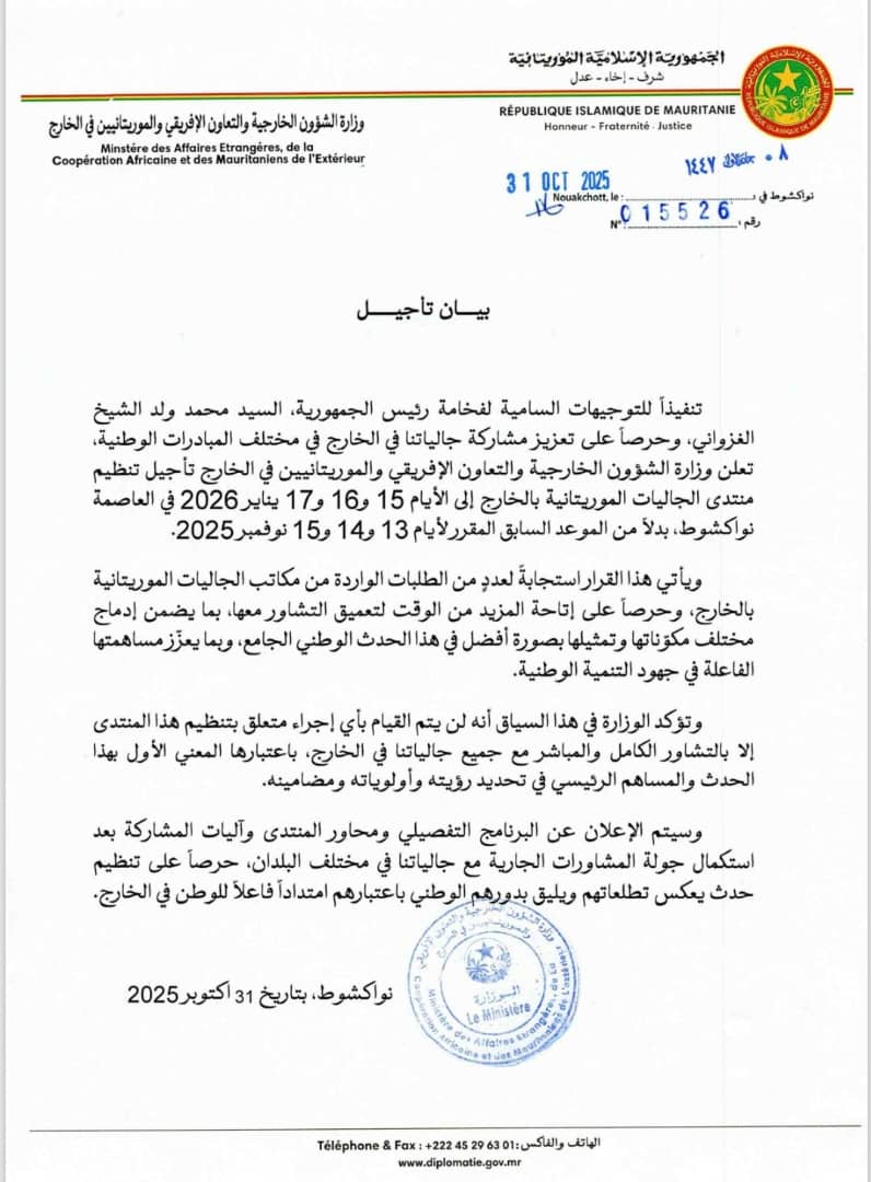 (المرابطون Tv) أعلنت وزارة الخارجية الموريتانية، عن تأجيل منتدى الجاليات الموريتانية في الخارج إلى الفترة من الـ 15 إلى الـ 17 من يناير 2026 في العاصمة نواكشوط، والذي كان من المقرر تنظيمه منتصف نوفمبر 2025.