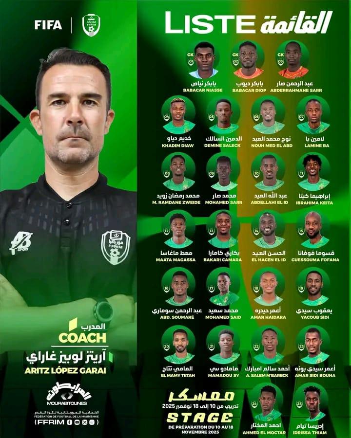 وعرفت القائمة التي ضمة خمسة وعشرين لاعبا استدعاء محمد صار لاعب افسى انواذيبو لاول مرة إضافة الى نجم الاكاديمية عبد الرحمن سوماري فيما غاب عن القائمة المستدعاة بيات الكوري و أبوبكاري كويتا ومحترفين آخرين