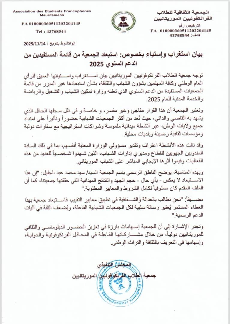(المرابطون Tv) عبرت جمعية الطلاب الفرنكوفونيين الموريتانيين عن استيائها من استبعادها الذي وصفته ب"الغير المبرر" من قائمة الجمعيات المستفيدة من الدعم السنوي الذي تعلنه وزارة تمكين الشباب والتشغيل والرياضة والخدمة المدنية للعام 2025.