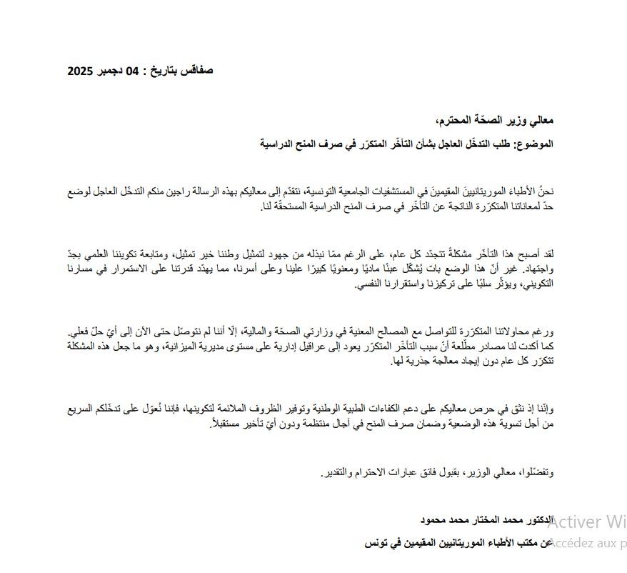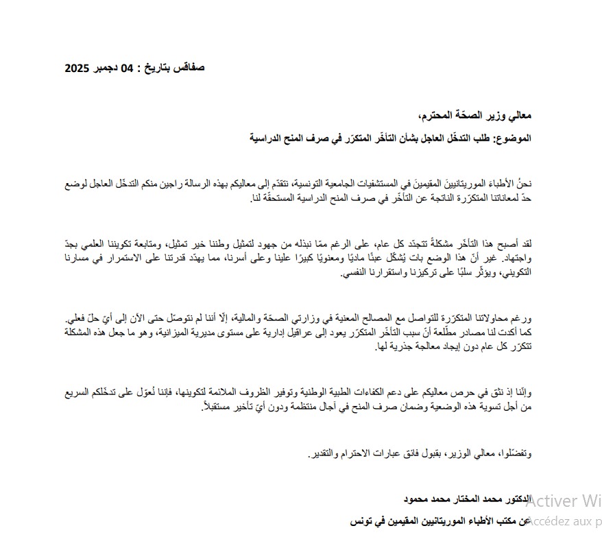 (المرابطون Tv) عبّر الأطباء الموريتانيون المقيمون في المستشفيات التونسية عن استيائهم من تكرار تأخر صرف منحهم الدراسية، معتبرين أن هذه المشكلة باتت تتكرر سنويًا دون حلول جذرية.
