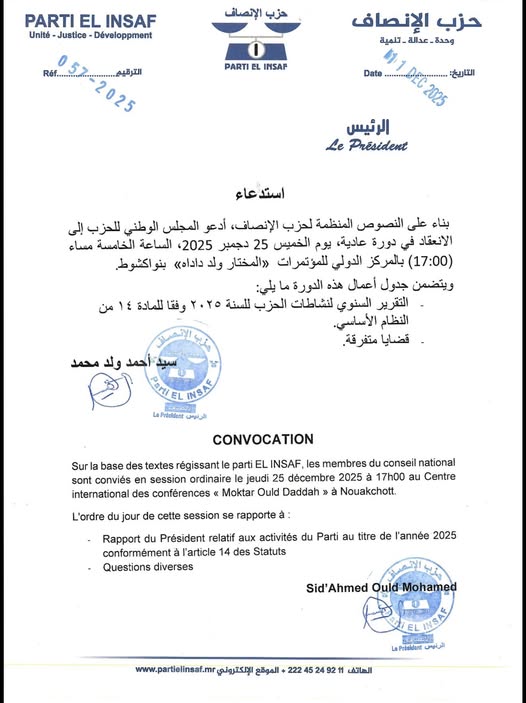 (المرابطون Tv) وجّه حزبُ الإنصاف الحاكم دعوةً رسمية لأعضاء مجلسه الوطني للانعقاد في دورةٍ عادية، وسط أنباء عن تغييرات محتلمة على مستوى قيادات الحزب، إلى جانب إدخال تعديلات على تشكيلة المجلس الوطني للحزب.