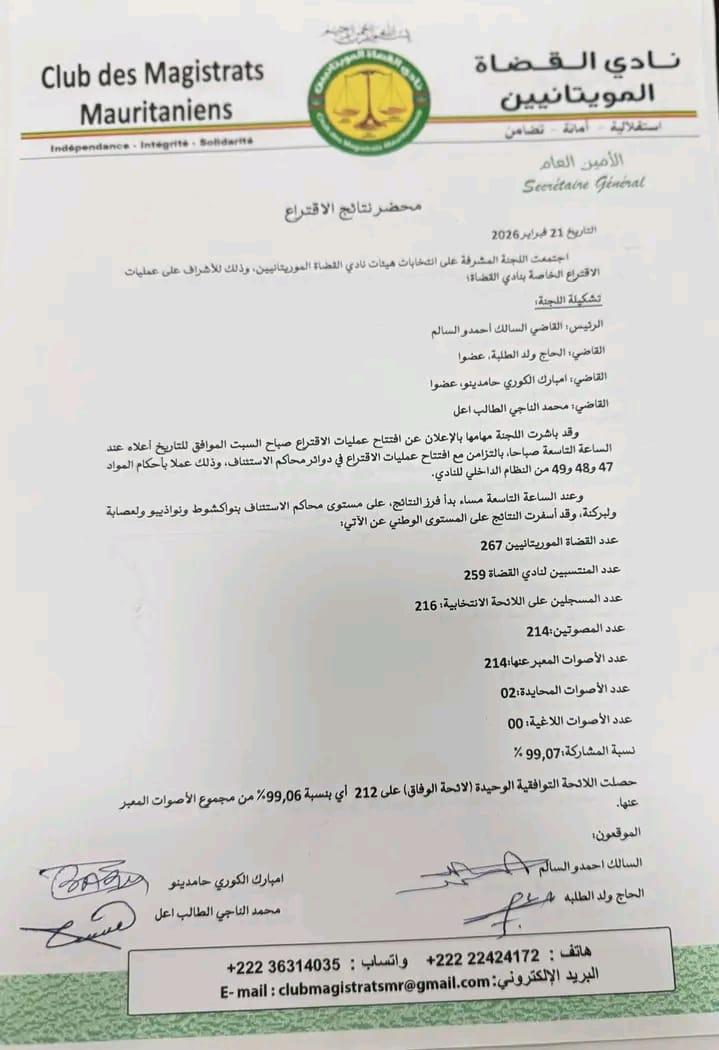 (المرابطون Tv) انتخب نادي القضاة الموريتانيين القاضي محمد الشيخ جدو أمينًا عامًا للنادي ، ومحمد ولد مسعود رئيسًا لمجلس القضاة في انتخابات بلغت نسبة المشاركة فيها أكثر من 99%.