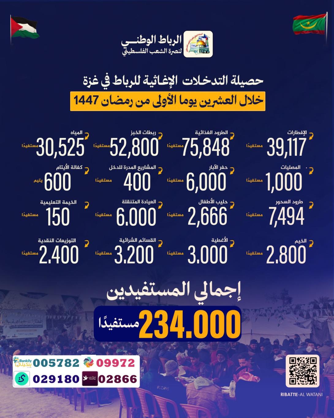واستفاد من الحملة وفقا للاحصائية التي نشرها الرباط اليوم السبت خلال العشرين يوما الأولى من رمضان 234.000 فرد من أهل غزة.